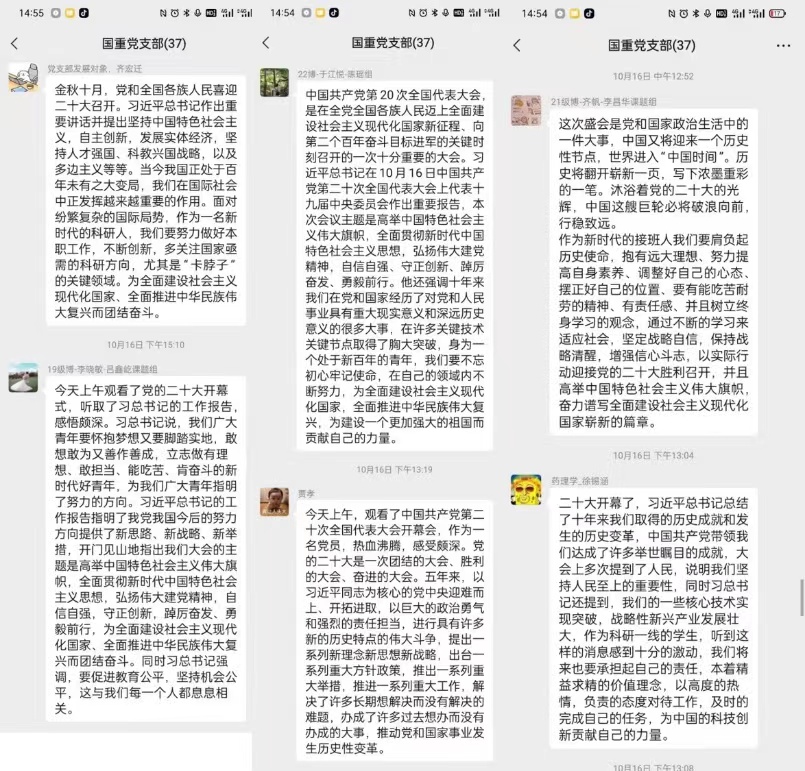 开幕会结束之后,为进一步贯彻领悟党的二十大精神,领悟党辉煌奋斗的百年征程,全体员工党支部积极响应公司党委号召,结合疫情防控要求,以“线上+线下+自学”相结合的方式,围绕学习贯彻党的二十大精神主题,深入开展“三会一课”和主题党日活动,真正把广老员工党员的思想和行动统一到党的二十大精神上来。必威betway博士生第一党支部、药化生国重博士生党支部、2021级硕士生党支部通过线上、线下交流学习体会的方式来加深学习效果;博士生第二党支部、国重硕士生党支部、2022级硕士生党支部通过党支书讲党课带头领学、支部党员互学的方式,深入学习党的二十大报告原文,巩固学习成果。2020级硕士生党支部、联合研究院2020-2021级硕士生党支部、联合研究院2022级硕士生党支部通过主题党日、主题宣讲和支部共建的方式丰富学习形式,确保学习成果取得实效。11月20日,学院还邀请党的二十大精神员工宣讲团为全体党员进行主题宣讲,再度掀起学习热潮。
